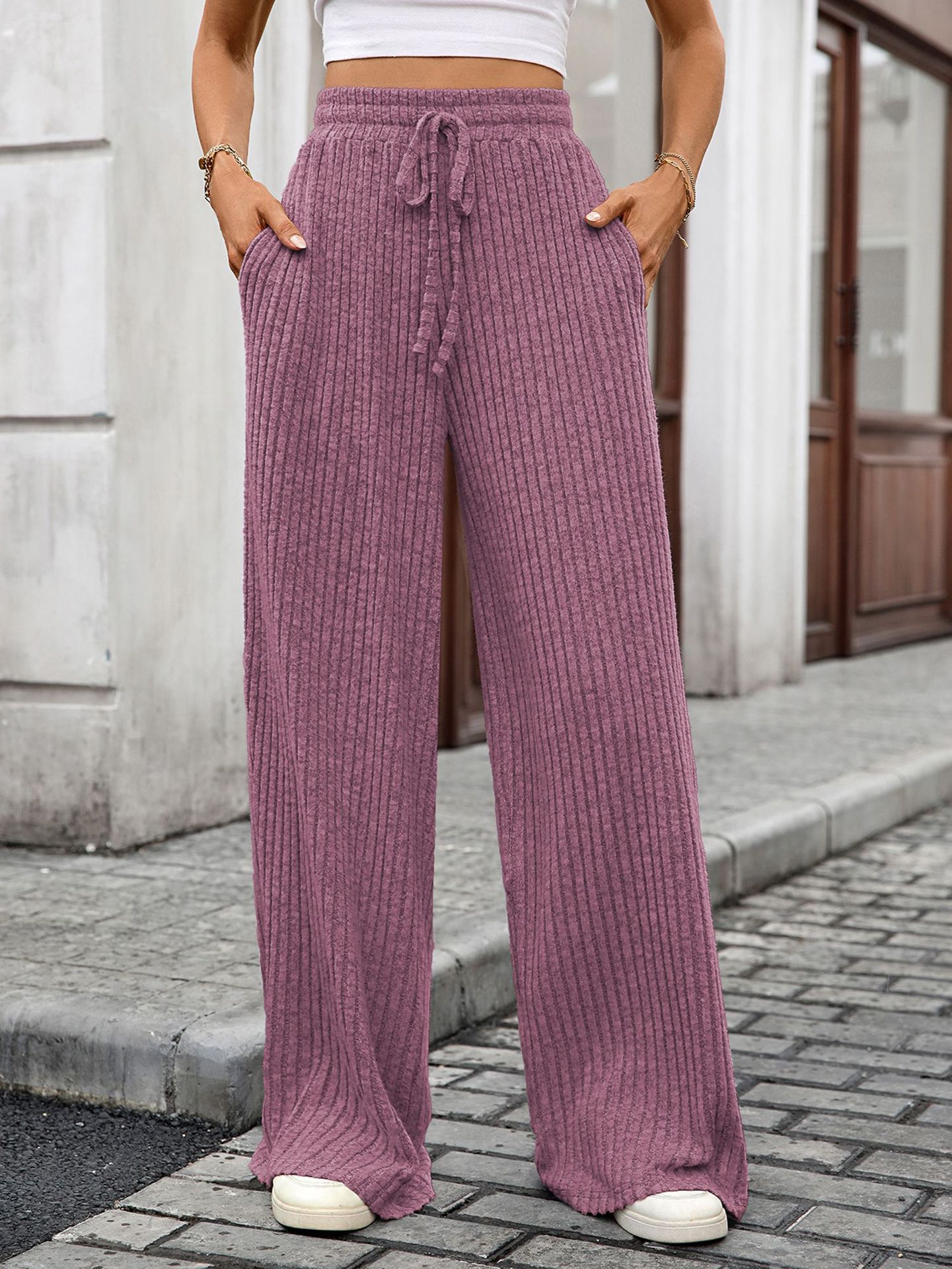 Autumn Winter Solid Color Drawstring Sunken Stripe Brushed Elastic Waist Casual Trousers
